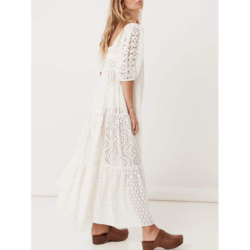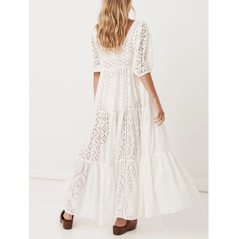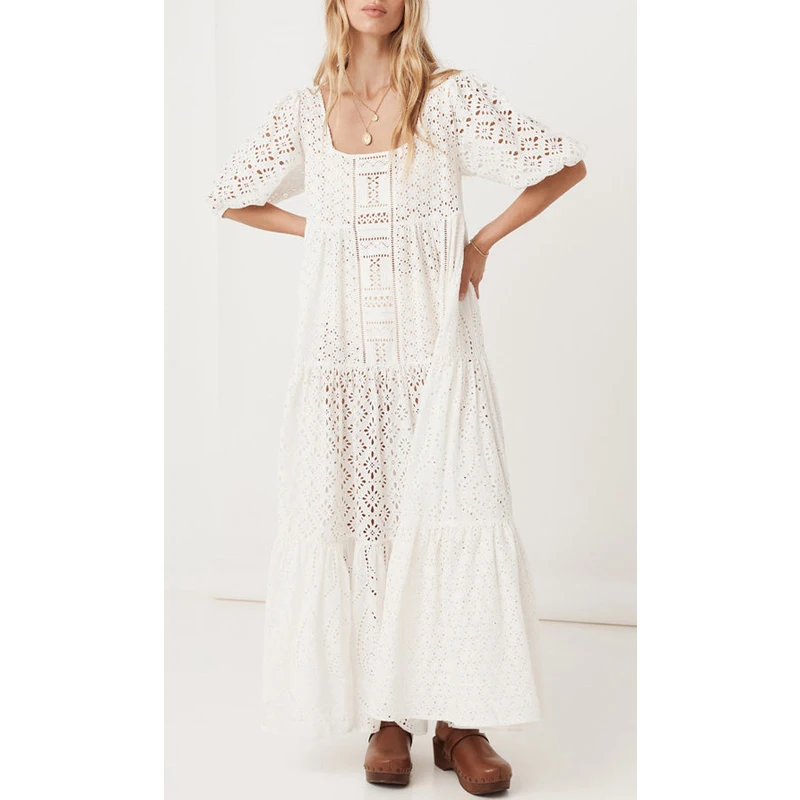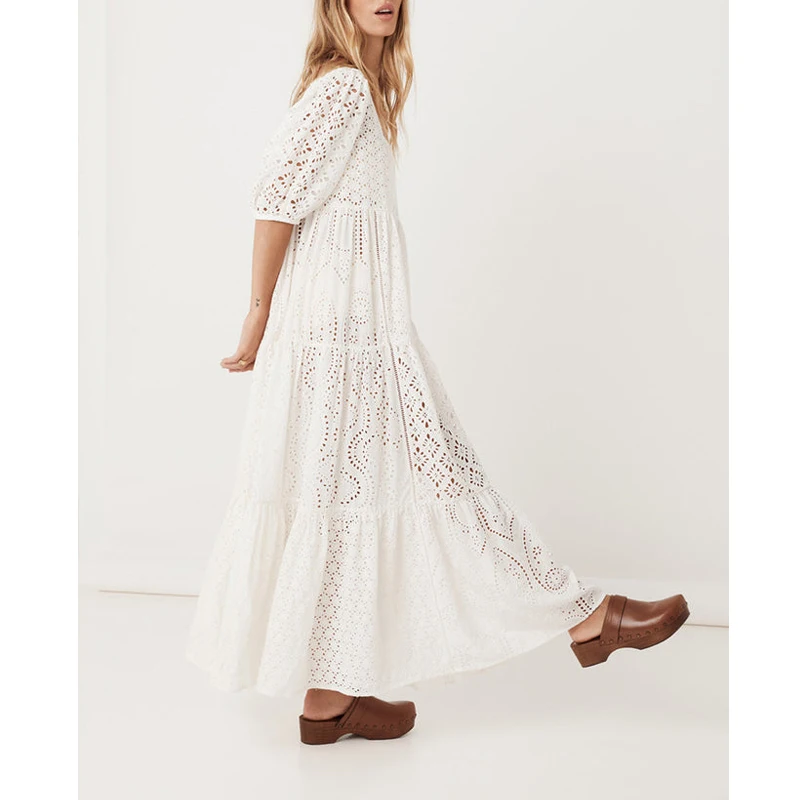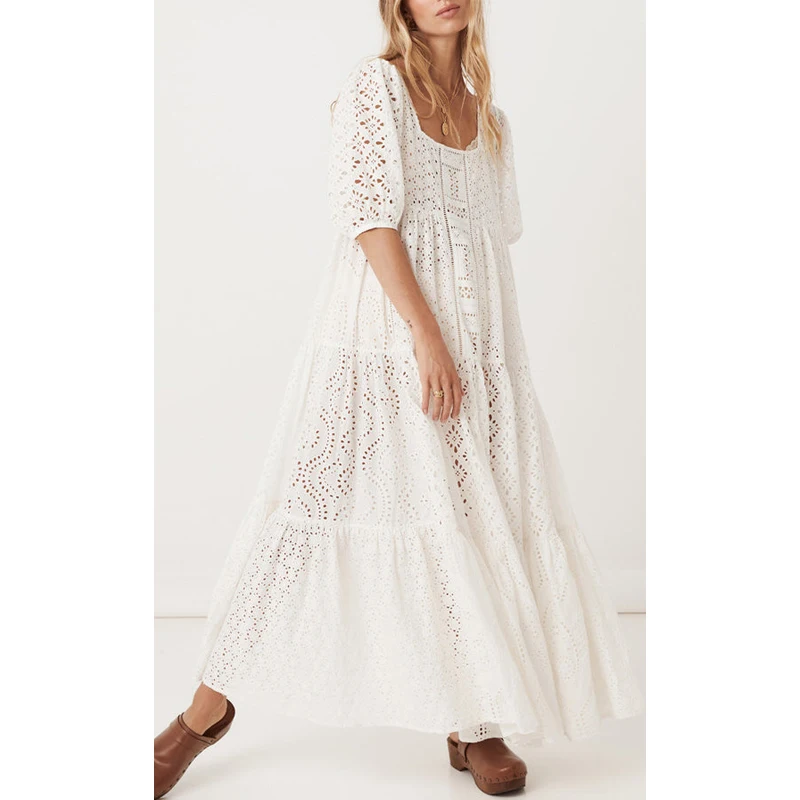 Embroidered Half Sleeve Loose Maxi Dress Bohemian Style Cotton Elegant Gowns